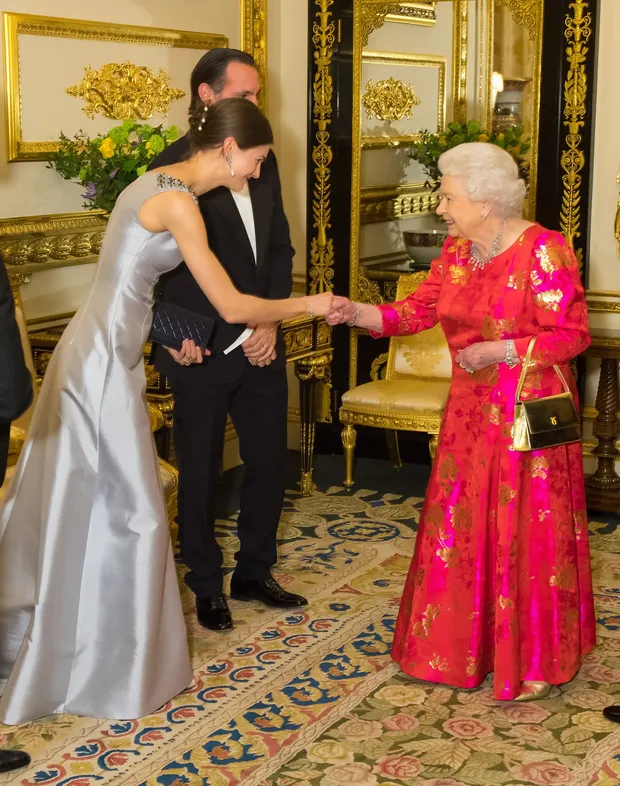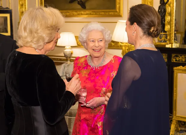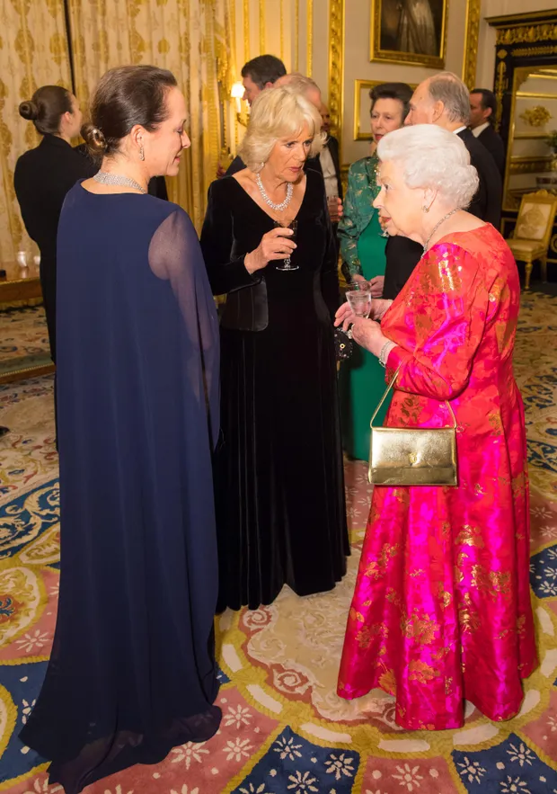На урочистому заході королева Єлизавета II з'явилась у яскравій червоно-рожевій сукні із золотими квітами. Вбрання глава Великобританії доповнила золотою сумочкою та такими ж туфлями на невеликих підборах. На вечір Єлизавета ІІ вбрала діамантові прикраси, які стильно доповнювали весняний образ королеви.