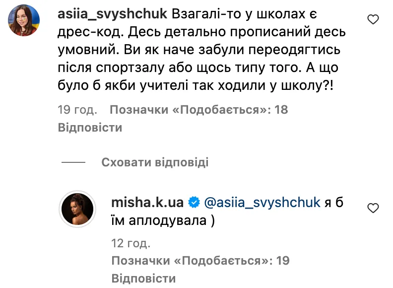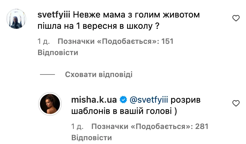 - "Мішина не гола, виглядає естетично, не вульгарно. Думаю, що такий аутфіт пасує і для 1 вересня!"