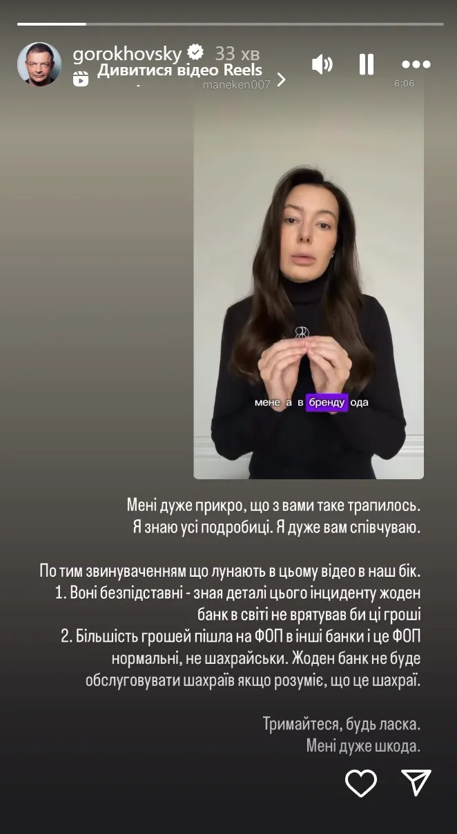 Олег Гороховський прокоментував ситуацію Ксюші Манекен, яка натрапила на шахраїв / Скриншот з інстаграм-сторіс