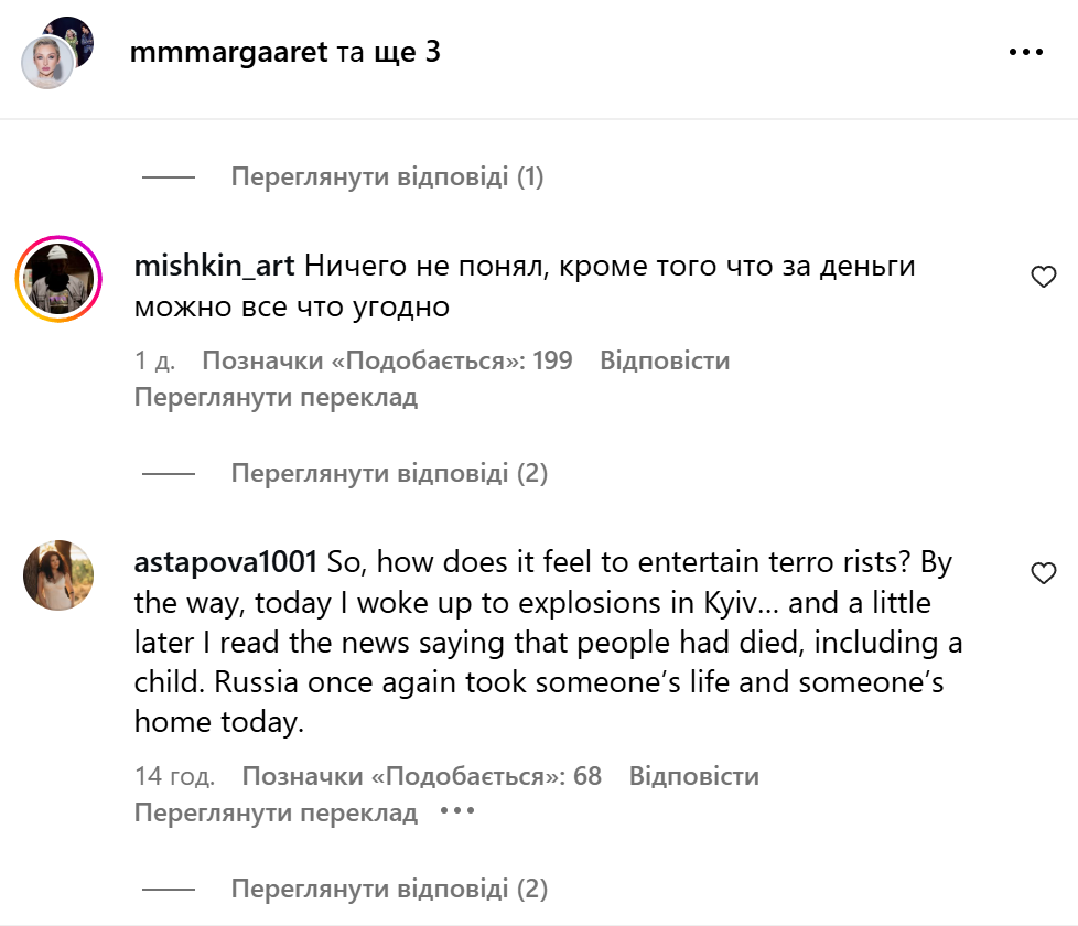- "Як ви себе почуваєте, розважаючи терористів? До речі, сьогодні я прокинулась від вибухів у Києві, а трохи пізніше прочитала новини про те, що загинули люди, включаючи дитину. Росія знову забрала чиєсь життя та чийсь дім";