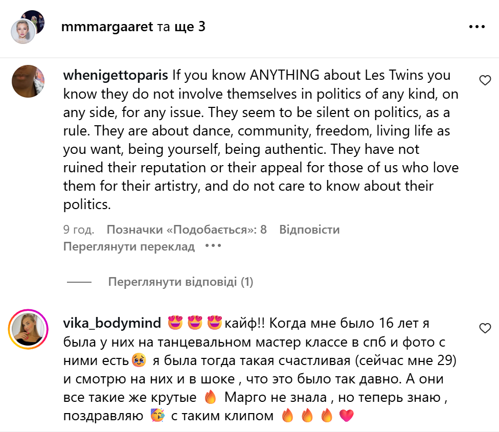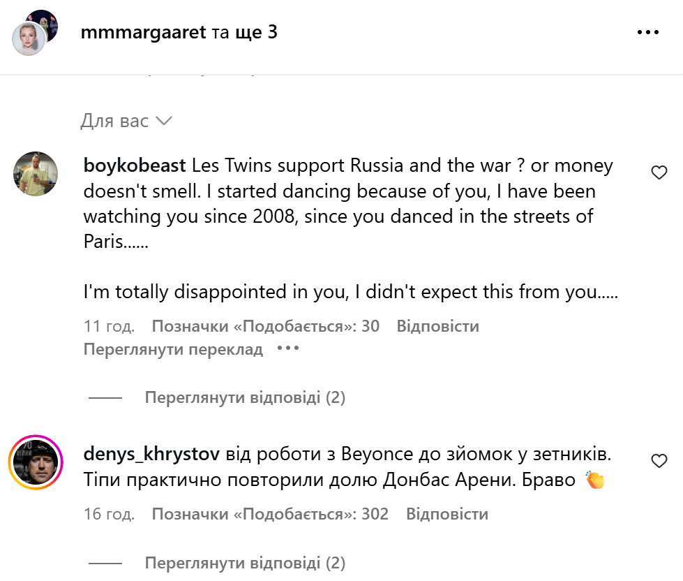 - "Les Twins підтримують Росію та війну? або гроші не пахнуть. Я почав танцювати завдяки вам, я дивлюсь на вас з 2008 року, відтоді як ви танцювали на вулицях Парижа. Я повністю розчарований, я не очікував цього від вас";