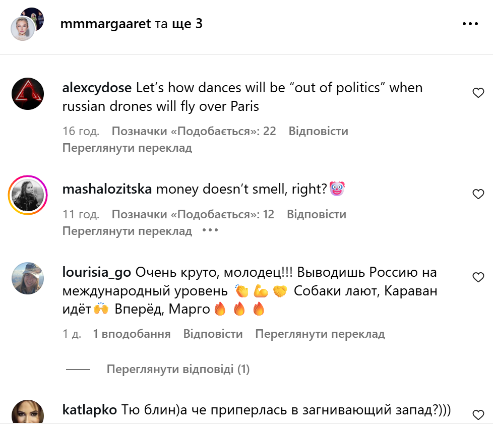 - "Дуже круто, молодець. Виводиш (Марго – 24 Канал) Росію на міжнародний рівень".
