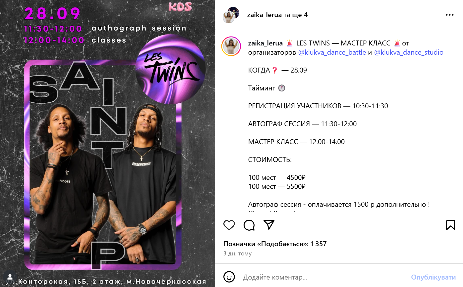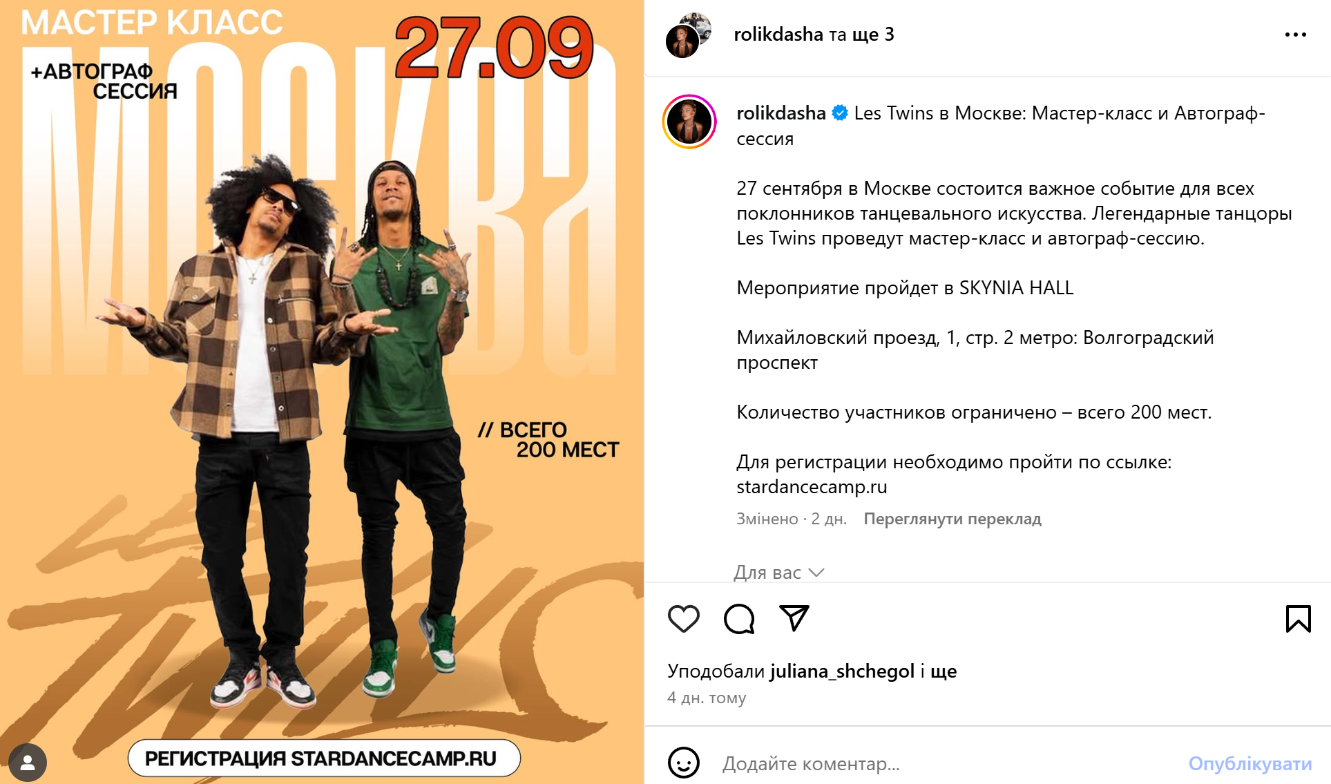 Les Twins 26 вересня виступили у Москві, а 28 вересня – у Санкт-Петербурзі, де стали підтанцьовкою американського R&B-артиста Джейсона Деруло. До того ж танцівники провели майстер-класи й автограф-сесії для російських фанів. Про що оголошували на їхній сторінці в інстаграмі.