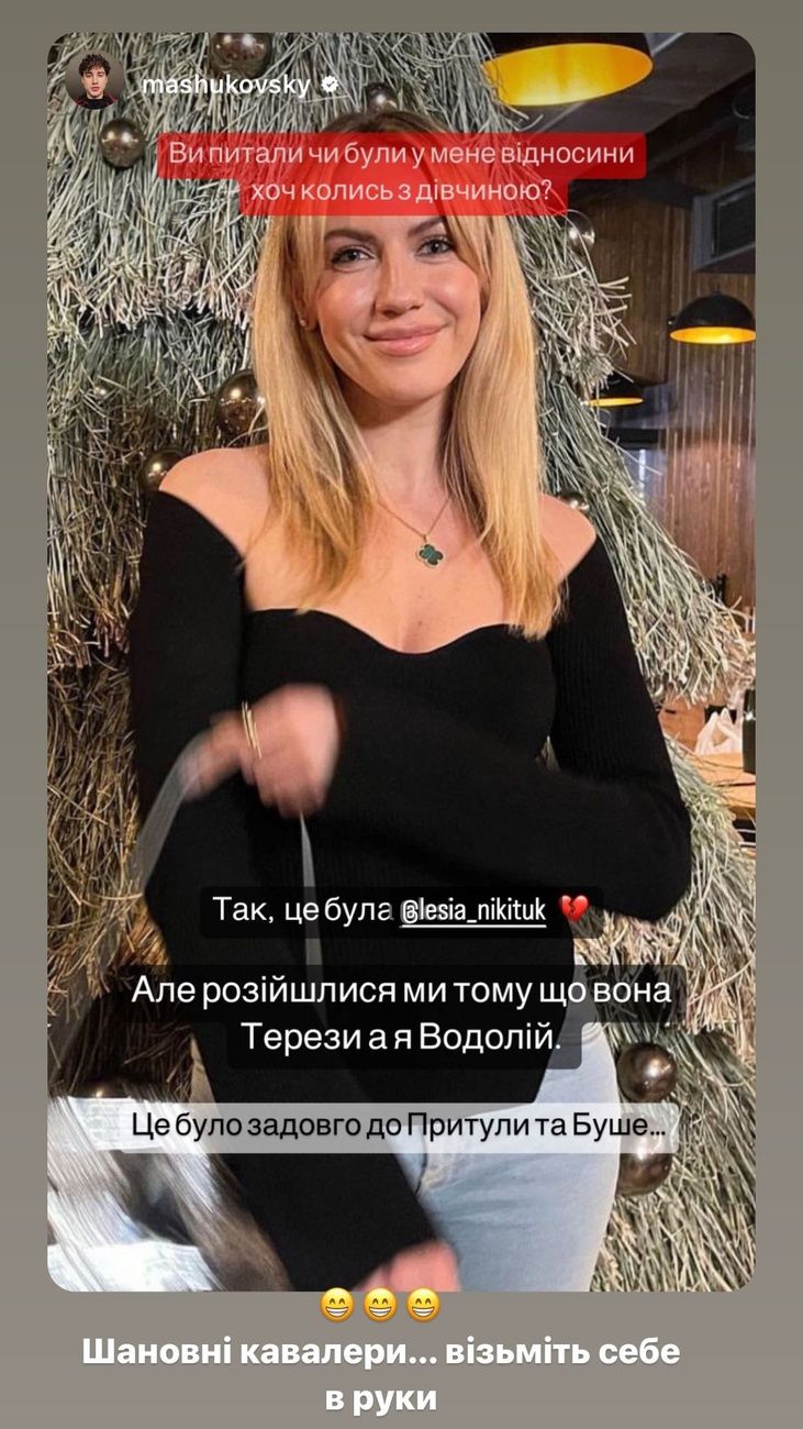 Після того, як мережею почали ширитись чутки про романи Лесі, Олег Машуковський опублікував жартівливу сторіс, де написав: "Тому що про таке не можна мовчати. Про кохання треба кричати. Це було задовго до Притули та Буше. Ми розійшлись, бо вона Терези, а я Водолій".
