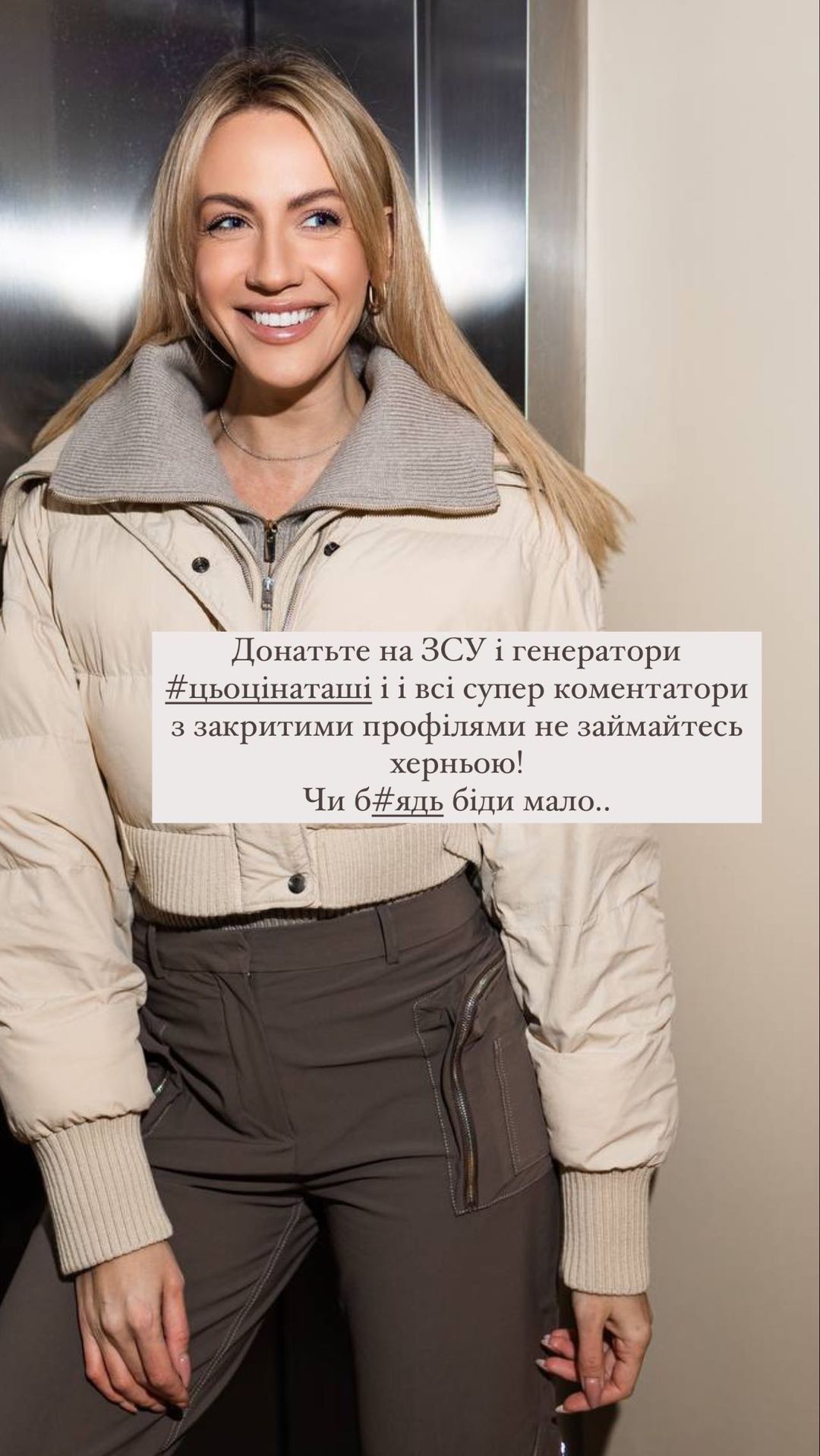 "Моя мама вашим дітям коменти не пише. Донатьте на ЗСУ і генератори, "цьоці Наташі" і всі суперкоментатори з закритими профілями. Не займайтеся х*рнею! Чи бл*дь біди мало?".