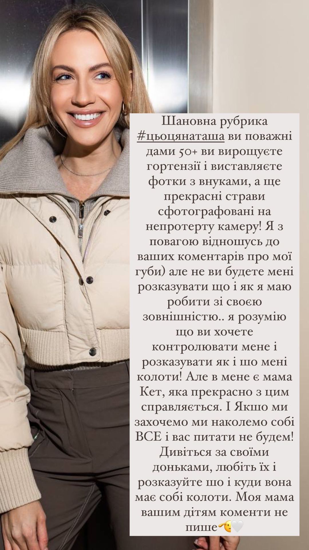 Шановна рубрика "цьоця Наташа" – ви поважні дами 50+, ви вирощуєте гортензії й виставляєте фотки з внуками, а ще прекрасні страви сфотографовані на не протерту камеру! Я з повагою ставлюсь до ваших коментарів про мої губи, але не ви будете мені розказувати, що і як я маю робити зі своєю зовнішністю,