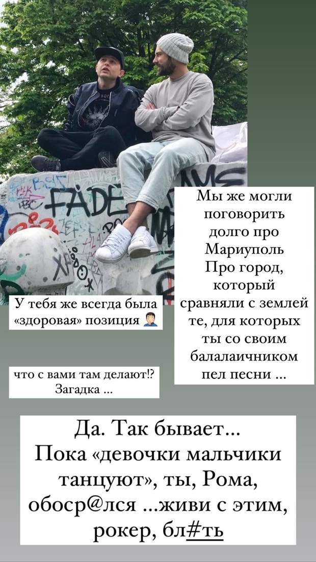 У тебе ж завжди була "здорова" позиція. Ми ж могли поговорити довго про Маріуполь. Про місто, яке зрівняли із землею ті, для яких ти зі своїм балалайщиком співав пісні. Що з вами там роблять?! Загадка! Так, так буває. Поки "дєвочкі, мальчікі танцюют", ти, Ромо, обіср*вся! Живи з цим! Рокер, бл*ть,