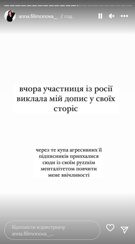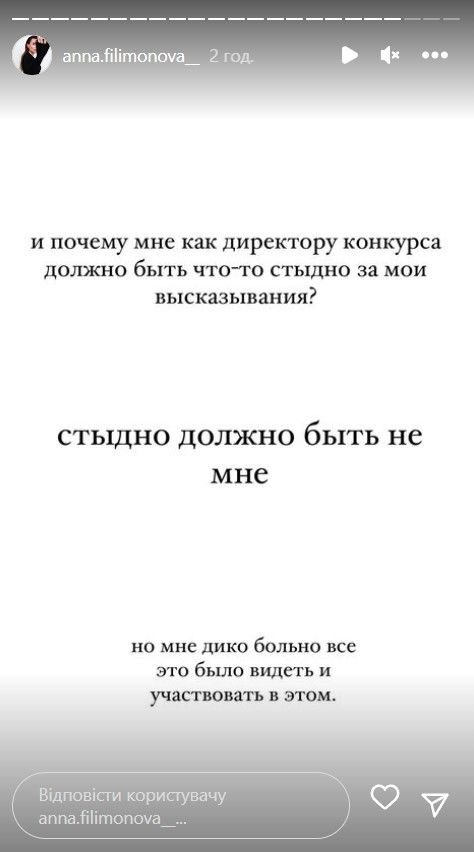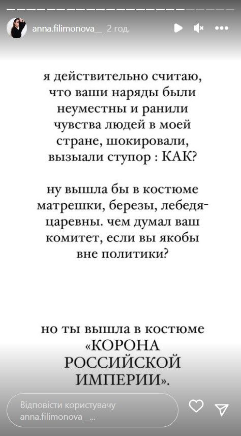 Як відповіла Філімонова росіянці / Фото з інстаграм-сторіс президентки українського конкурсу