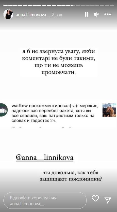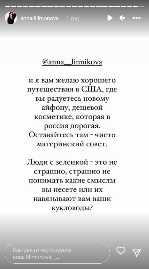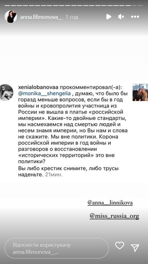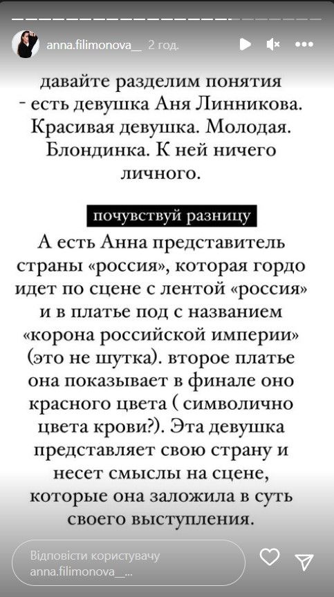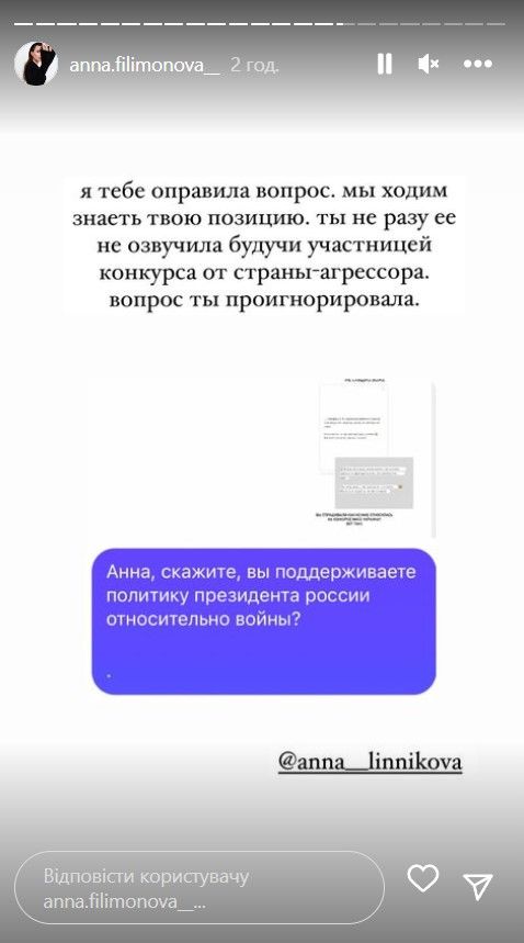 Але такі слова не сподобались росіянці Лінніковій. Вона поширила допис у своїх сторіз, аби росіяни змогли перейти на нього та залишити власні коментарі, і написала від себе: "І це директорка "Міс Україна". Як не стидно, Боже. Ви запитували, як до мене ставилась на конкурсі "Міс Україна"? От так. І ці люди давали інтерв'ю і розповідали, яка я погана. Подивіться самі".