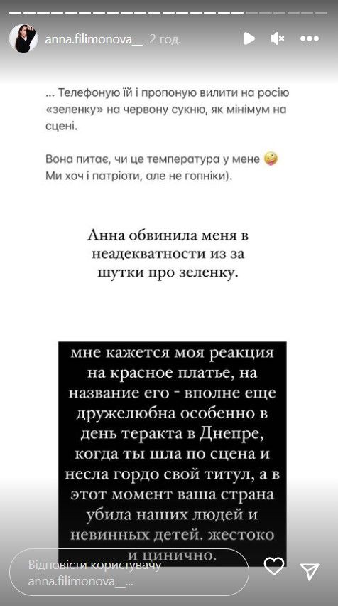 Тепер лавина з російських "ботів" перекотилась на президентку українського конкурсу Філімонову. Днем раніше вона опублікувала допис, де розповіла про лаштунки заходу у Новому Орлеані: як готувались до конкурсу, як створювали костюми та робили зміни в останній момент, та що робили, коли дізнались про трагедію у Дніпрі. У той момент Анна зателефонувала Вікторії та іронічно запропонувала вилити на червону сукню Ліннікової зеленку, на що Апанасенко віджартувалась, що "вони не гопніки".