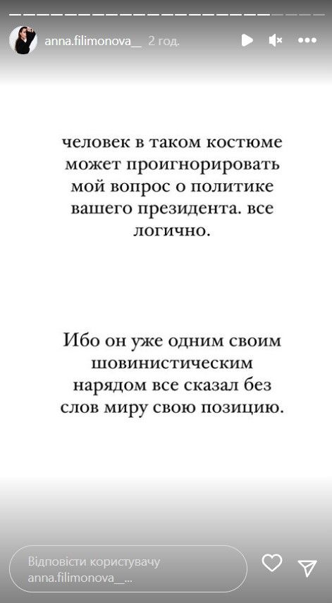 Людина в такому костюмі може проігнорувати моє питання про політику вашого президента. Все логічно. Тому що вже одним своїм шовіністичним вбранням все сказала без слів світові про власну позицію,