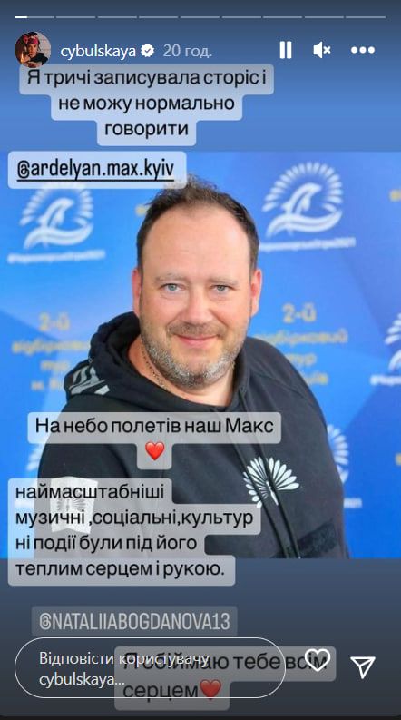 - Оля Цибульська: "Я тричі записувала сторіс і не можу нормально говорити. На небо полетів наш Макс. Наймасштабніші музичні, соціальні, культурні події були під його теплим серцем і рукою. Наталю, я обіймаю тебе всім серцем".