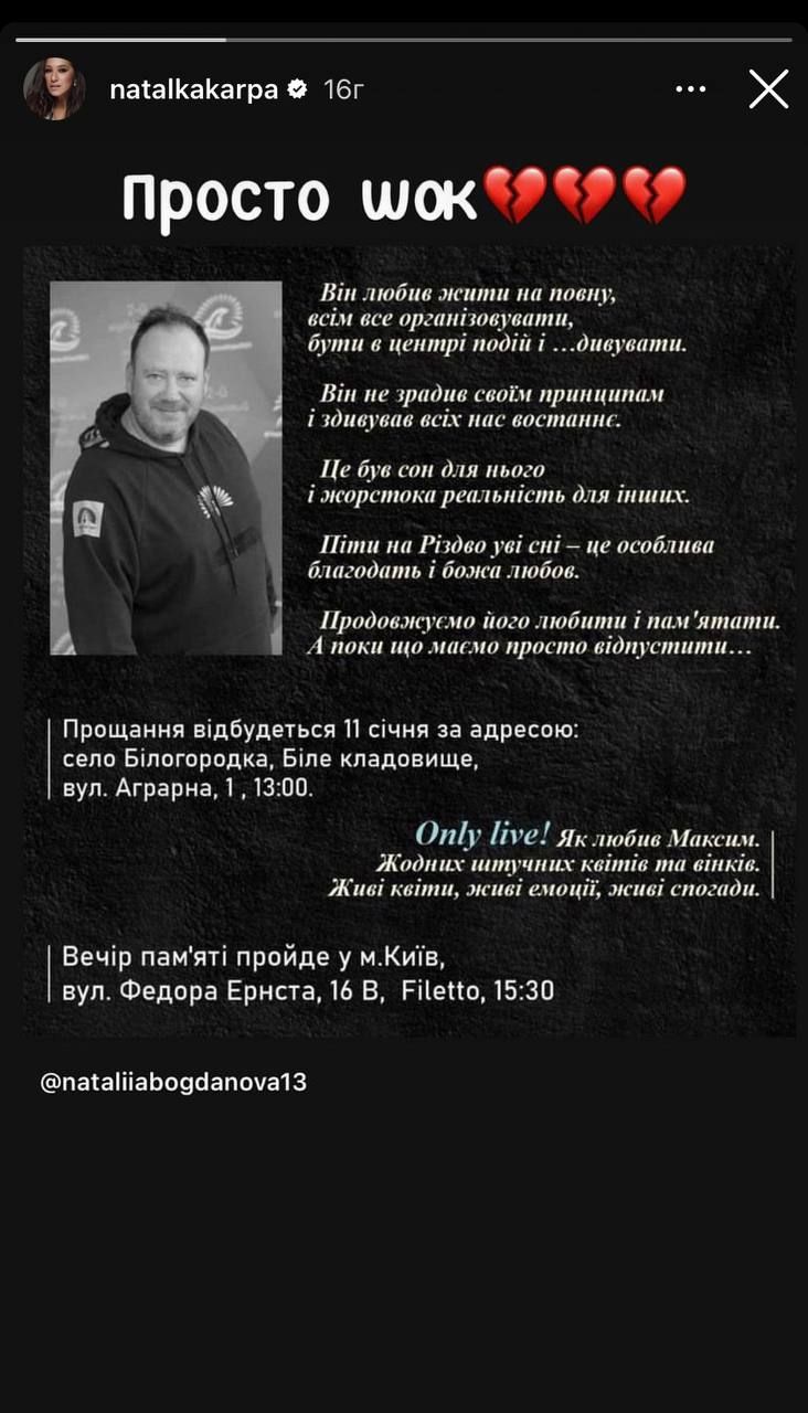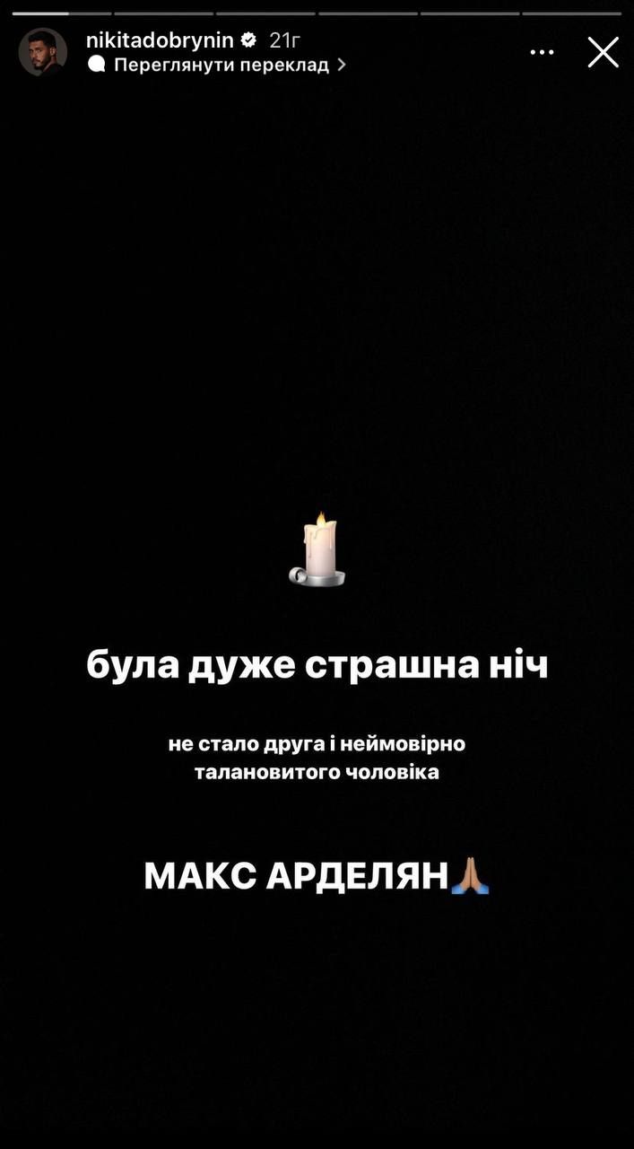 - Нікіта Добринін: "Була дуже страшна ніч. Не стало друга і неймовірно талановитого чоловіка. Макс Арделян".