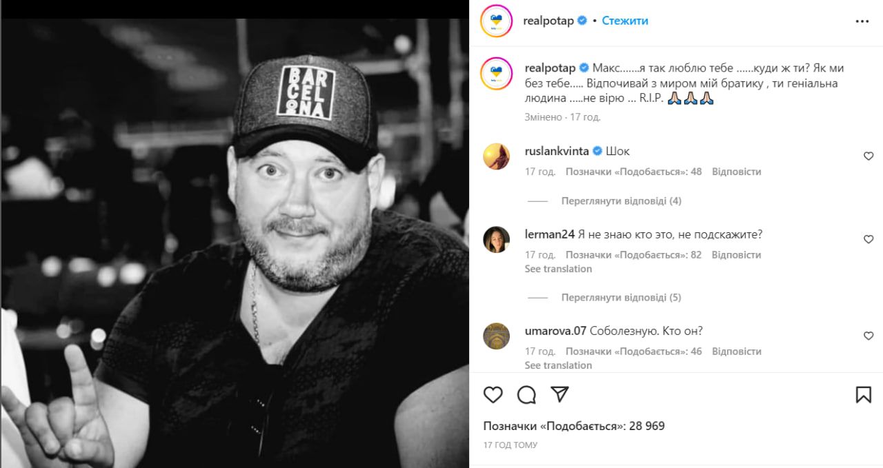 - Потап: "Максе, я так люблю тебе. Куди ж ти? Як ми без тебе? Відпочивай з миром, мій братику. Ти геніальна людина. Не вірю. R.I.P".