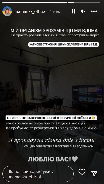 Зараз сім'я відпочиває від надзвичайно складних 2 місяців гастролей за кордоном. Після повернення до Києва MamaRika одразу захворіла.