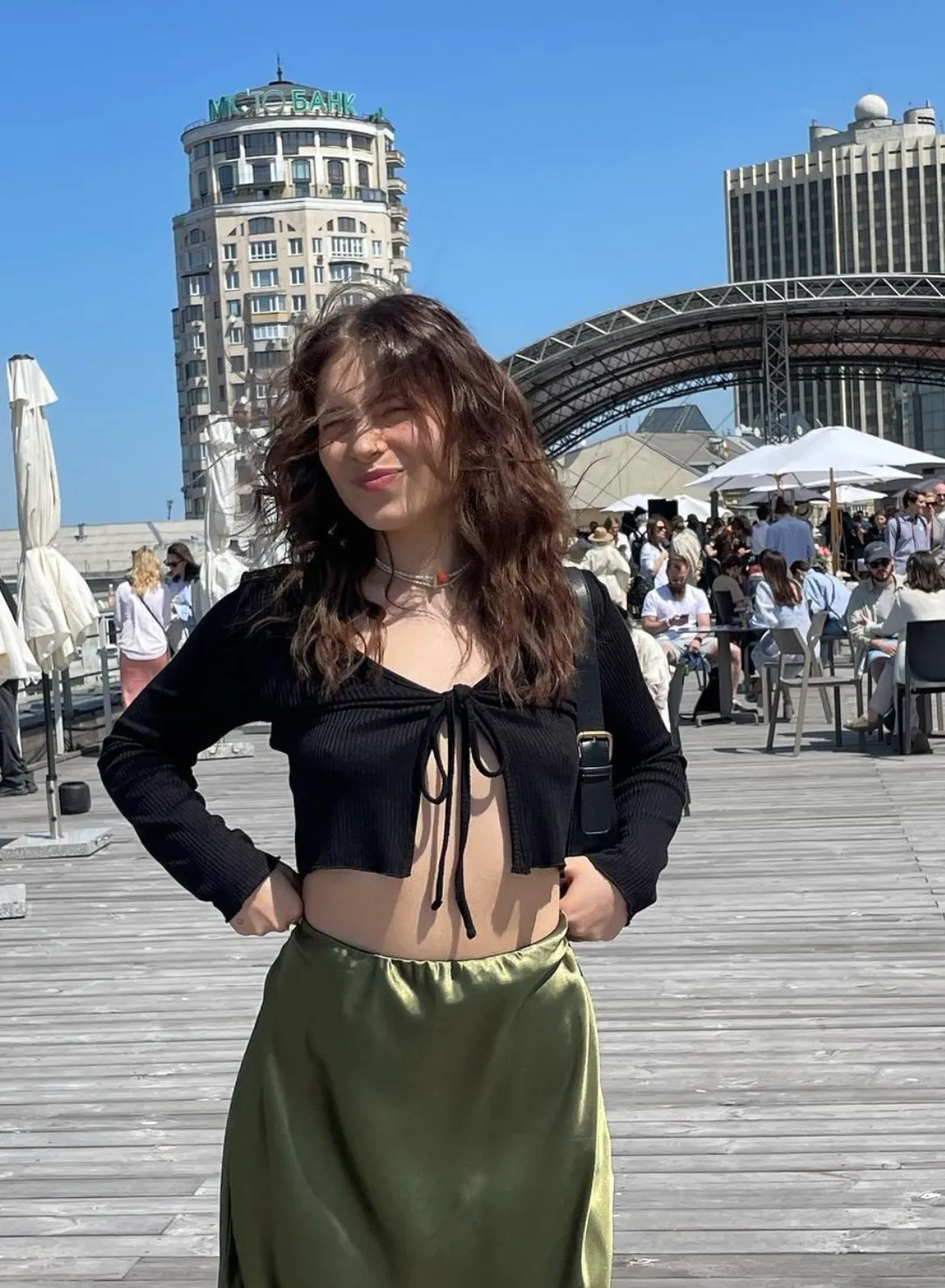Старша донька телеведучої позувала на терасі ресторану в стильному та доволі зухвалому образі — чорному відвертому топі та зеленій атласній спідниці.