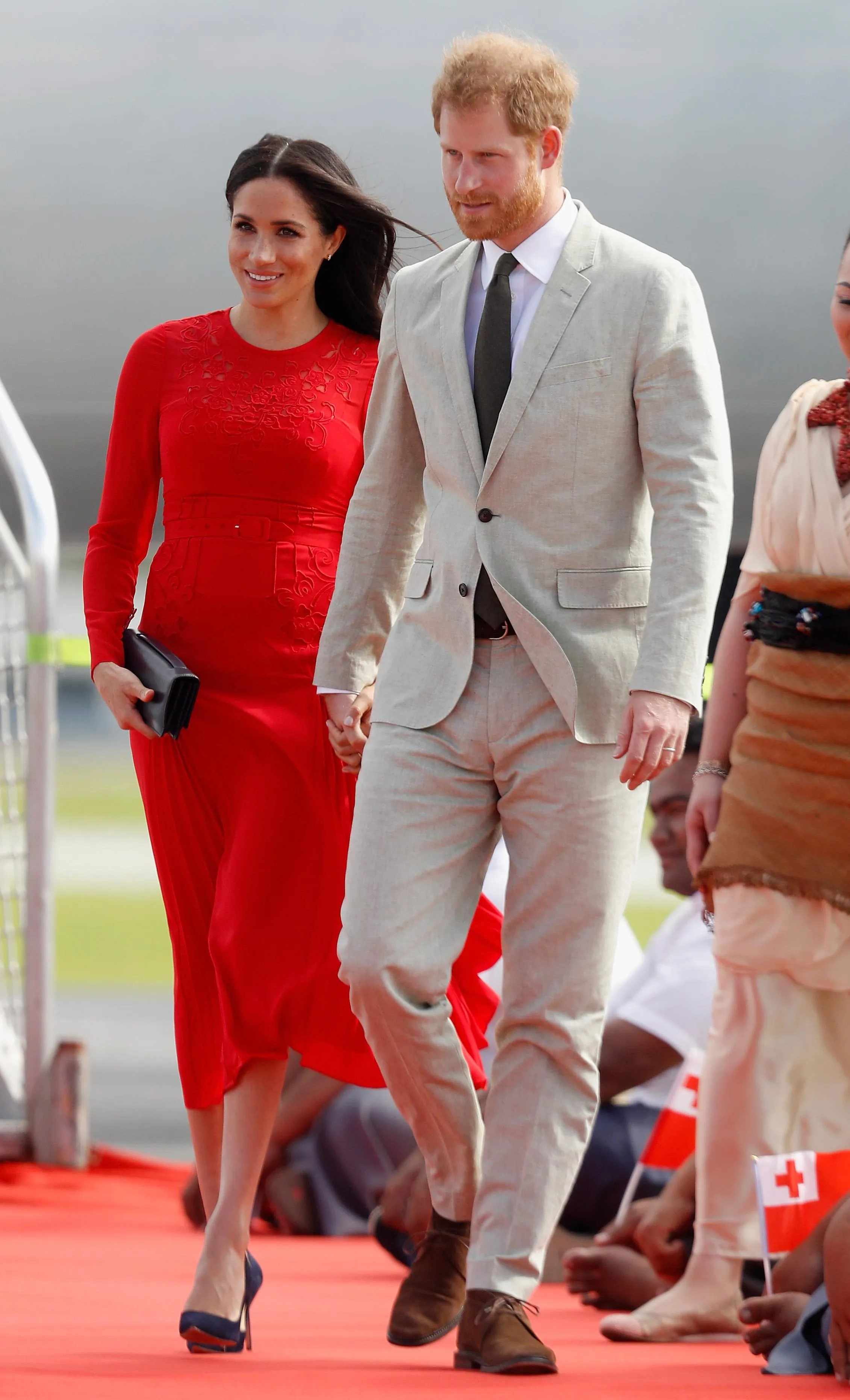 Варто зазначити, що кумедний конфуз із герцогинею Сассекською стався під час візиту королівського подружжя до острова Тонга. Із приватного літака Меган вийшла у яскравій червоній сукні від Self-Portrait. Вбрання мало стильну вишивку та маленький пояс на талії. До сукні вона підібрала чорне взуття на підборах та клатч.