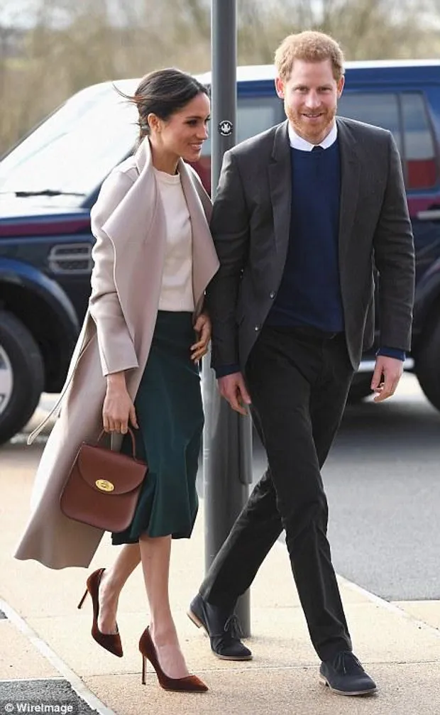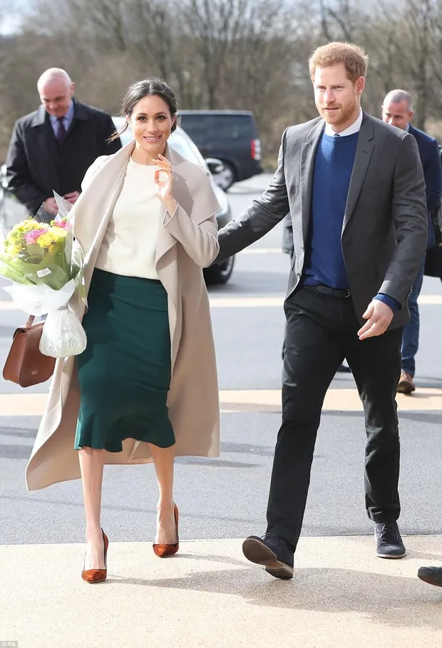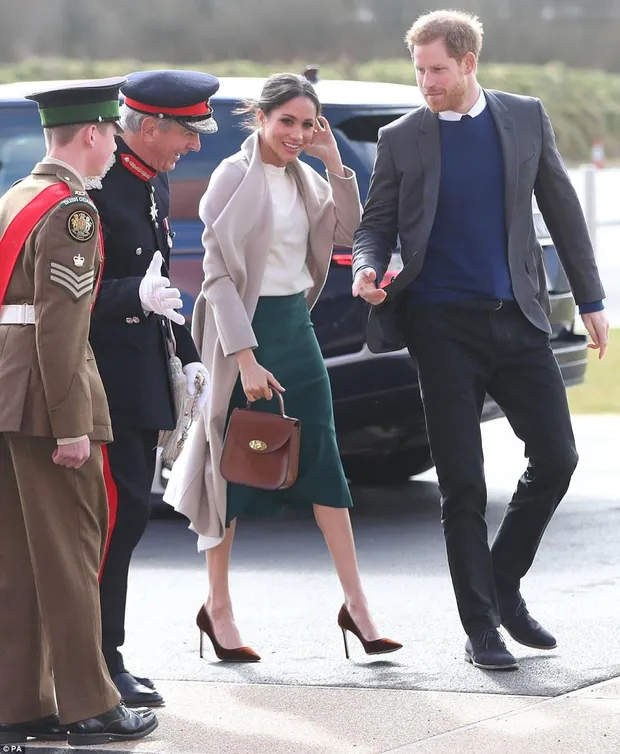 Вся увага британців була прикута до чарівного образу Меган Маркл. Акторка вбрала світле пальто від Mackage, вартістю 750 доларів, кашеміровий джемпер від бренду Вікторії Бекхем та зелену спідницю Greta Constantine. Стильний образ Меган Маркл доповнила коричневими туфлями на підборах та сумочкою.