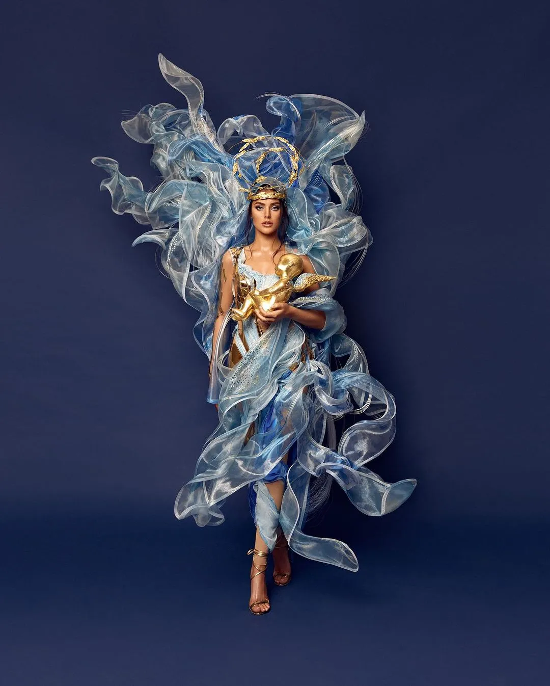 Національний костюм для Ангеліни Усанової створила велика команда МÜ production – це "Берегиня-Мати". Блакитні кольори – символ мирного неба, білий та молочний – миру. Золоті елементи – це броня, а тіло янголятка – символ неоціненного життя кожної дитини. Вбрання присвячене всім матерям України.