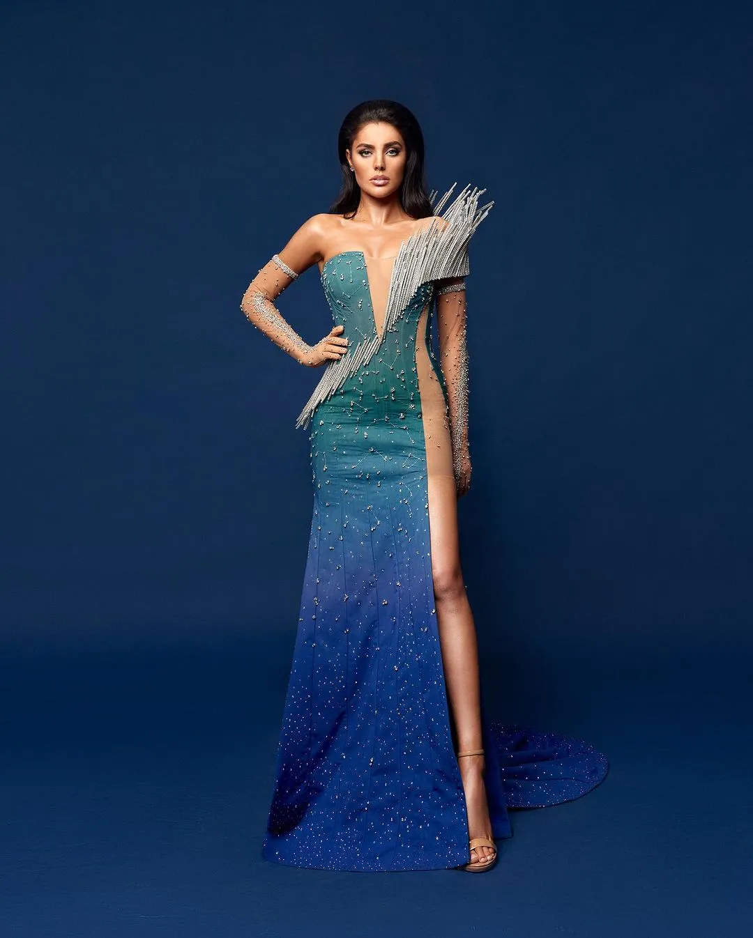 Головна вечірня сукня для "Міс Всесвіт України" створена дизайнерами бренду FROLOV. Майстри передали космічну тематику конкурсу та представили Україну як наш Всесвіт – це головна метафора, закладена у вбранні.