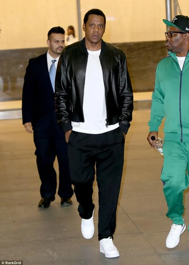 А Jay-Z обрав чорні штани, класичну білу футболку, яка поєднувалася з кедами, і шкіряною курткою.