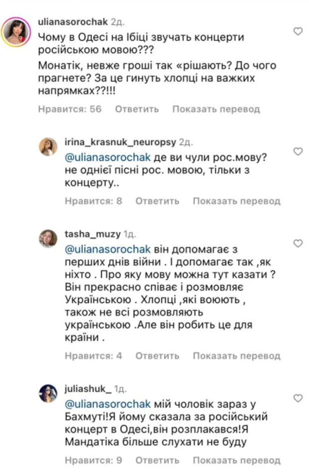 Монатік отримав хейт за концерт в Одесі / Скриншот коментарів