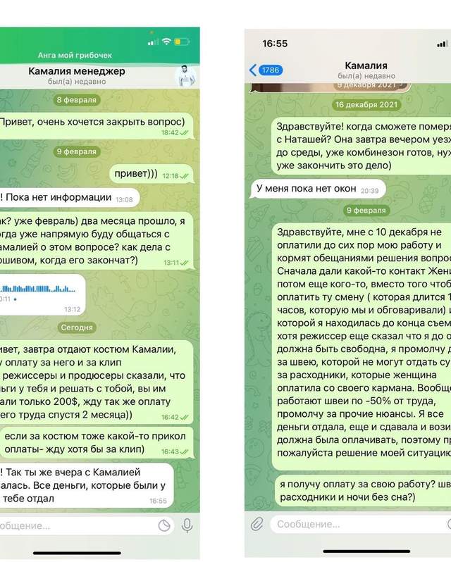 Починаючи з 10 грудня я відпрацювала зміну (12 годин), за яку мені віддали тільки половину (яку мені ще довелося вибороти, 3 місяці не виплачують розхідники за пошиття, переносять його і моєї швачки (яка пошила вже 2 костюми, не спавши ночами), потім просто нас ігнорували й зараз мені кажуть, що моїх грошей немає, і за пошиття, і просто мій витрачений час мені не заплатять, тому що віддали не в термін (пробачте, ця артистка просто хворіла щомісяця і від'їжджала відпочивати, тому в терміні винна я), А свою роботу на кліпі я просто, мабуть, не повинна отримувати, тому що у них так заведено ставитися до людей.