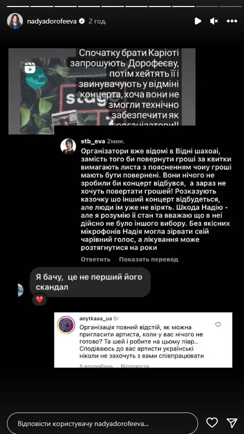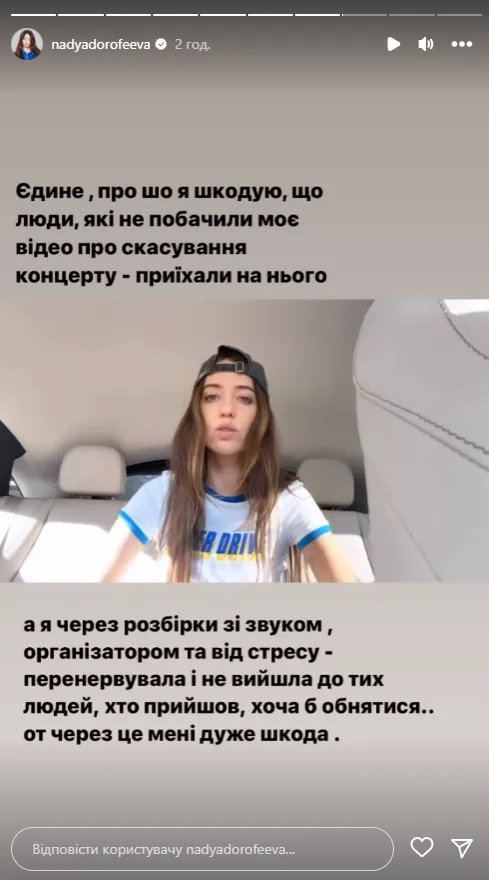 Надя Дорофєєва розповіла про організаторів / Скриншот з її інстаграму