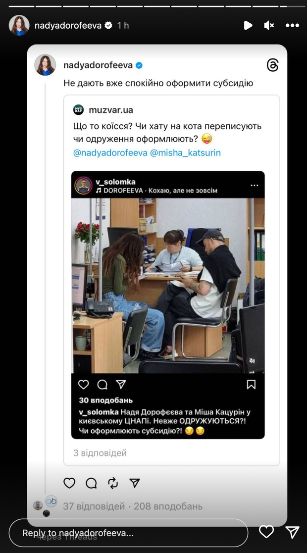 Сама Надя Дорофєєва вже відреагувала на це фото. Вона перепостила його в інстаграм-сторіс та пожартувала, що їм вже не дають спокійно оформити субсидію. Цим зірка спростувала чутки про одруження.