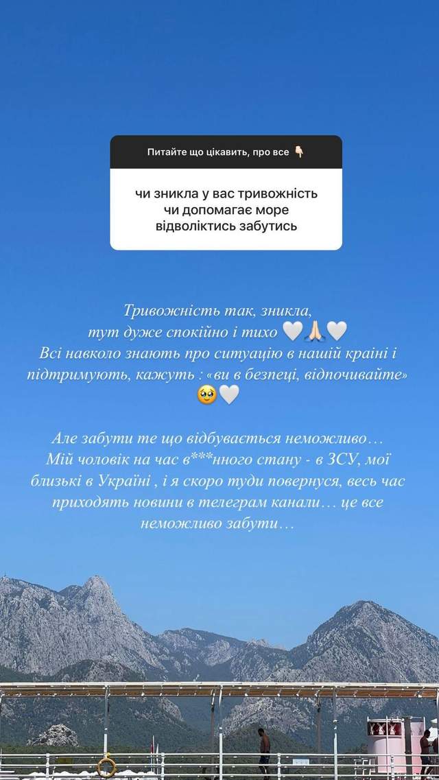 Вона розповіла, що в Туреччині в неї зникла тривожність, від якої 5 місяців не могла позбутися в Україні. Однак розслабитися зірка не може, адже забути про війну – нереально.