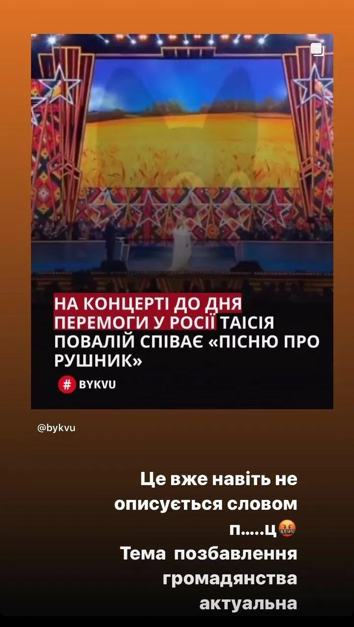 Телезірка теж не оминула темою виступ Повалій. Вона зізналась, що перебуває у роздумах і не може вирішити, що гірше – концерт Таїсії чи божевільні святкування 9 травня.