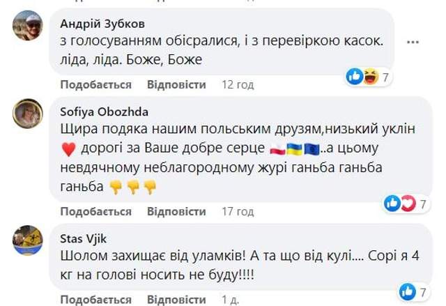 - "Який ідіотизм. Нащо ви знищили шоломи? Ви реально вважаєте, що вони призначені для захисту від куль? Що ж, тепер справді вірю, що ви не розумієте, чому це ваше 10 місце для Польщі на Євробаченні означає нуль балів".