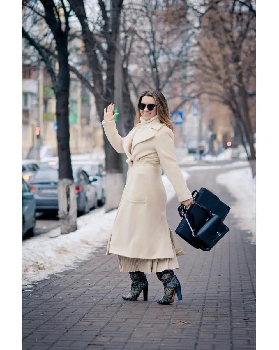 Зірка розмістила у своєму блозі серію зимових фото, які приголомшили мережу. Перед камерою Наталія Могилевська постала у світлому пальто з поясом, яке підкреслило її струнку фігуру. Міді-спідниця та гольф доповнили її модний образ. Окрім цього, співачка приміряла трендові чоботи на стійких підборах та окуляри. Маленька чорна сумочка завершила ефектний look Наталії Могилевської.