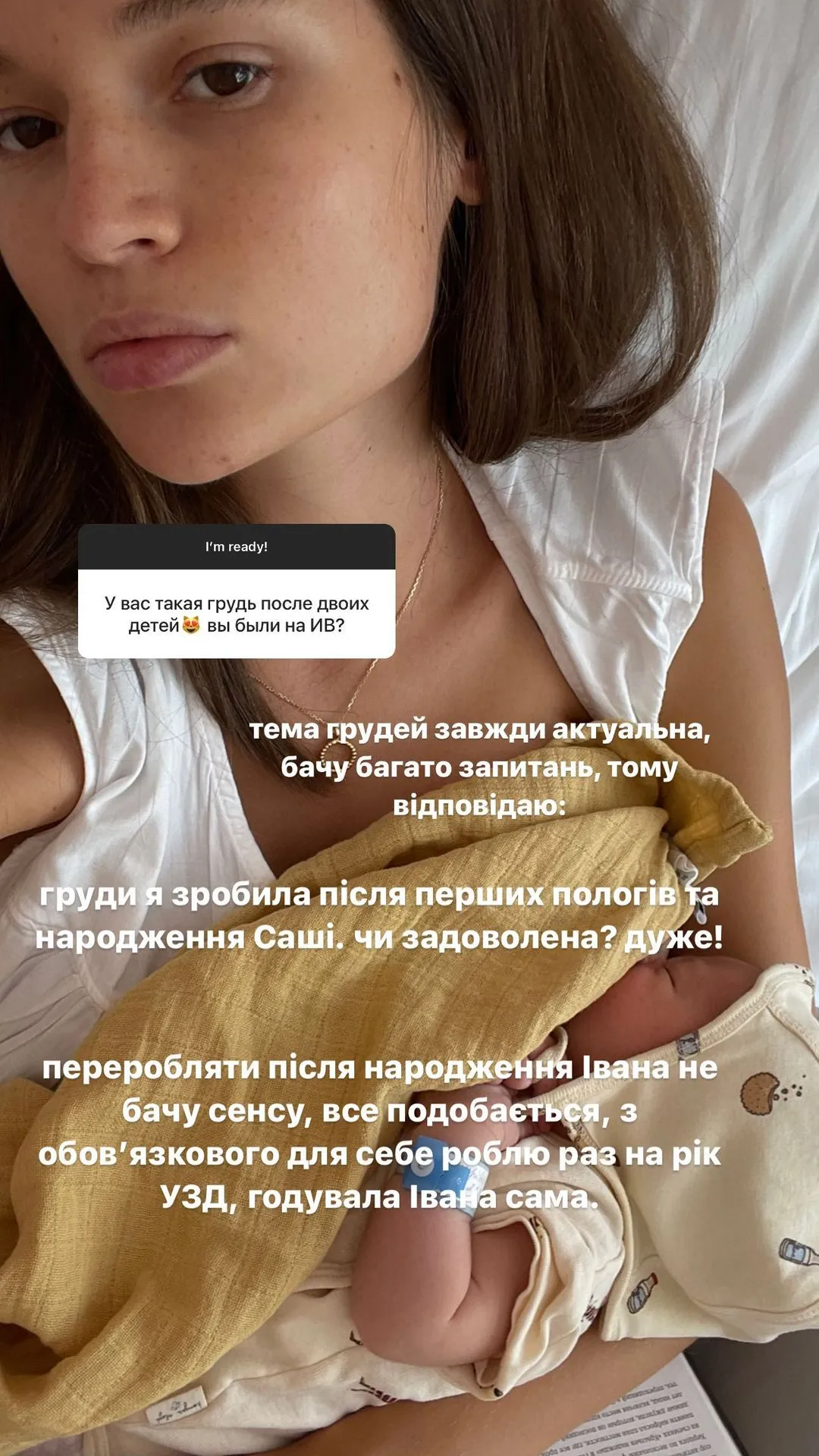 Тема грудей завжди актуальна, бачу багато запитань, тому відповідаю. Груди я зробила після перших пологів та народження Саші. Чи задоволена? Дуже! Переробляти після народження Івана не бачу сенсу, все подобається. З обов'язкового – для себе роблю УЗД раз на рік. Годувала Івана сама,