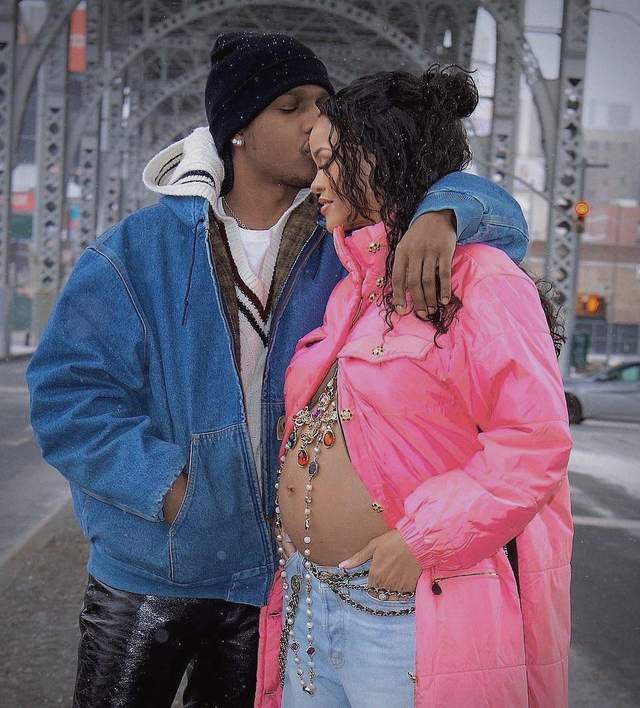 На знімках щаслива пара тримається за руки та романтично споглядає один на одного. Для фото A$AP Rocky одягнув чорні шкіряні штани, білий світшот, джинсову куртку та чорну шапку, водночас як Ріанна зачарувала фанів широкими блакитними штанами з розрізами та довгою рожевою курткою на ґудзиках, яку привідкрила в зоні живота. Особливим акцентом образу стали довгі підвіски на шиї, які сягали її тазу.