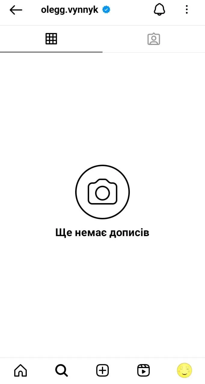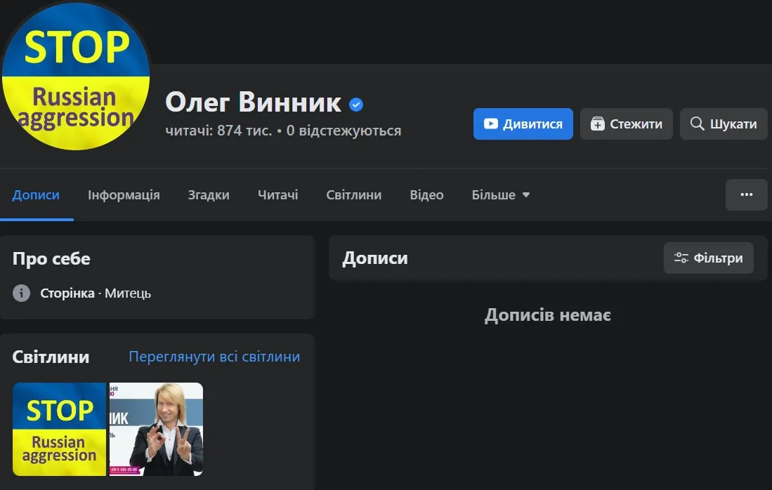 Порожньою стала сторінка Олега в інстаграмі та фейсбуці. На головному фото – синьо-жовта картинка із закликом зупинити війну.