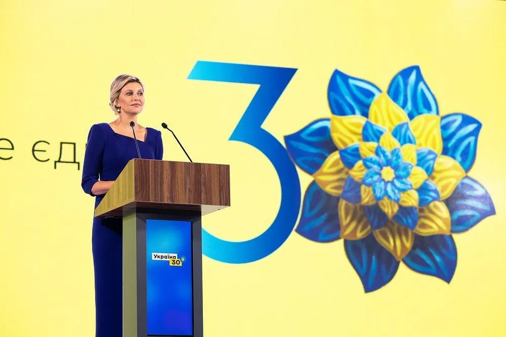 Дружина президента Зеленського у понеділок, 2 серпня, презентувала концепцію святкування Дня Незалежності, виступивши на форумі "Україна 30. Імідж України". Вона опублікувала серію нових фото на офіційній сторінці в інстаграмі.