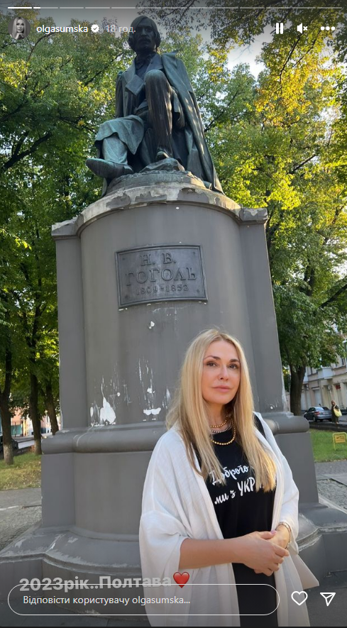 Акторка опублікувала світлини, що були зроблені на тлі пам'ятника Миколі Гоголю в Полтаві. На першому фото вона постала в елегантному образі. 16-річна Ольга позувала в спідниці, блузці та в піджаку. До свого образу вона додала витончену підвіску, сережки та сумку. Що цікаво, раніше Сумська була брюнеткою.