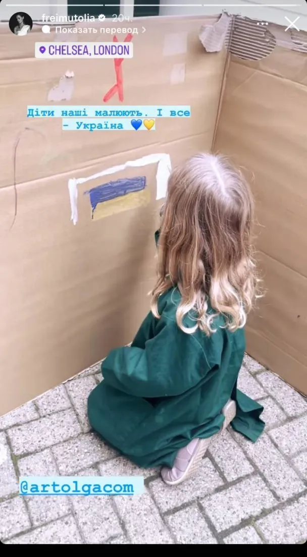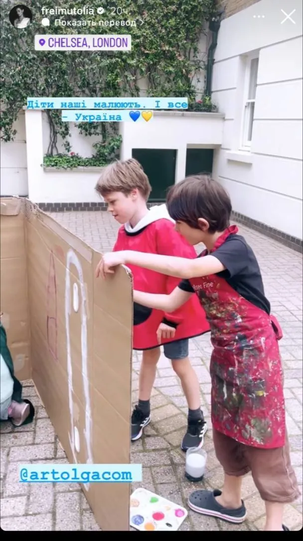На фото помітно, що діти на подвір'ї займалися малюванням. На картоні вони зобразили прапори України. Зокрема, 7-річний син ведучої Валерій малював разом зі своїм приятелем.