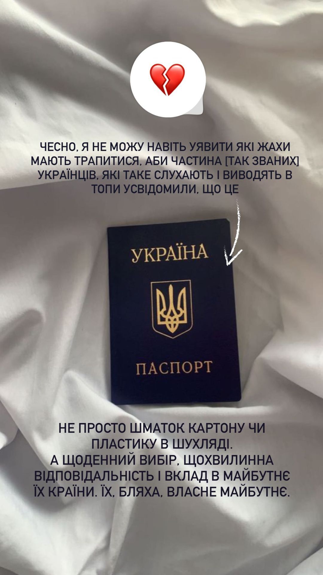Чесно, я не можу навіть уявити, які жахи мають трапитися, аби частина (так званих) українців, які таке слухають і виводять в топи, усвідомили що паспорт громадянина України – не просто шматок картону чи пластику у шухляді. Це щоденний вибір, щохвилинна відповідальність і вклад в майбутнє їхньої країни, їхнього майбутнього,