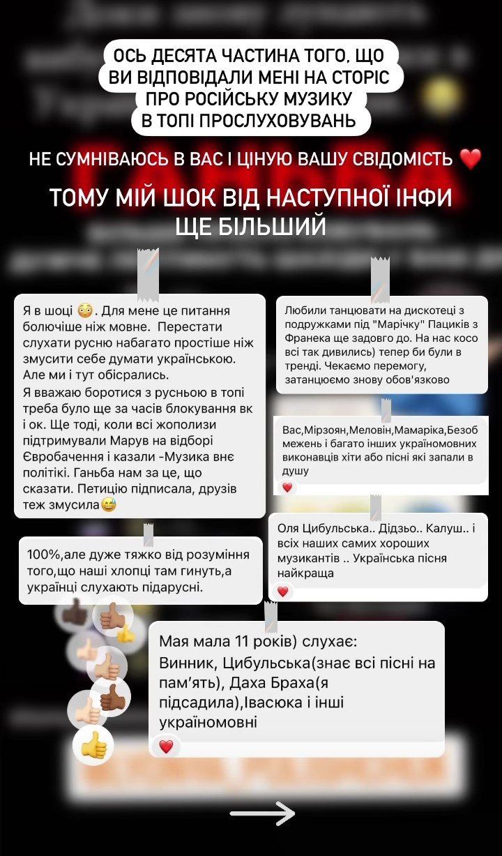 Співачка поділилась, що її шанувальники здебільшого слухають українську музику. Вона показала повідомлення від фанів, де ті розповідають про улюблених виконавців – гурт БЕЗ ОБМЕЖЕНЬ, MELOVIN, MamaRika та інших.
