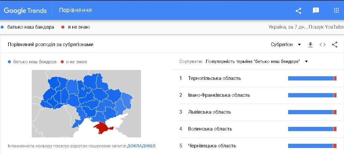 Упродовж останніх 7 днів пісню "Батько наш Бандера" на YouTube шукали набагато частіше, аніж трек Моргенштерна і Slava Marlow "Я не знаю". Патріотична композиція перемогла російську за кількістю пошукових запитів на всій материковій Україні.
