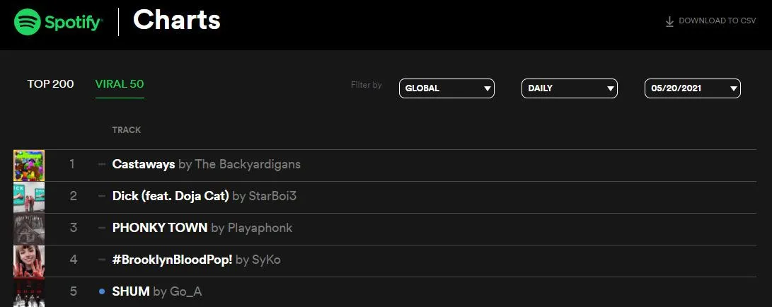 Трек гурту Go_A зайняв 5 сходинку за кількістю прослуховувань. 20 травня SHUM увійшов до 50 найбільш вірусних пісень у світі.