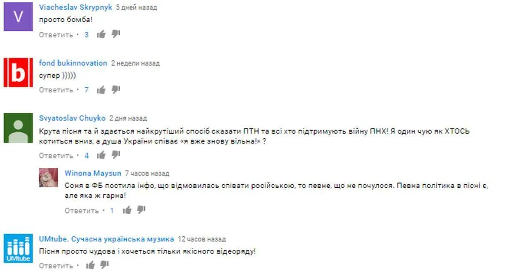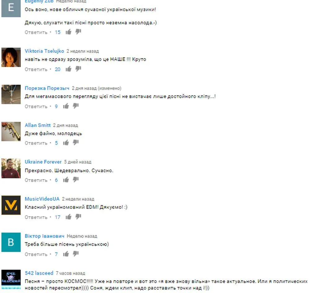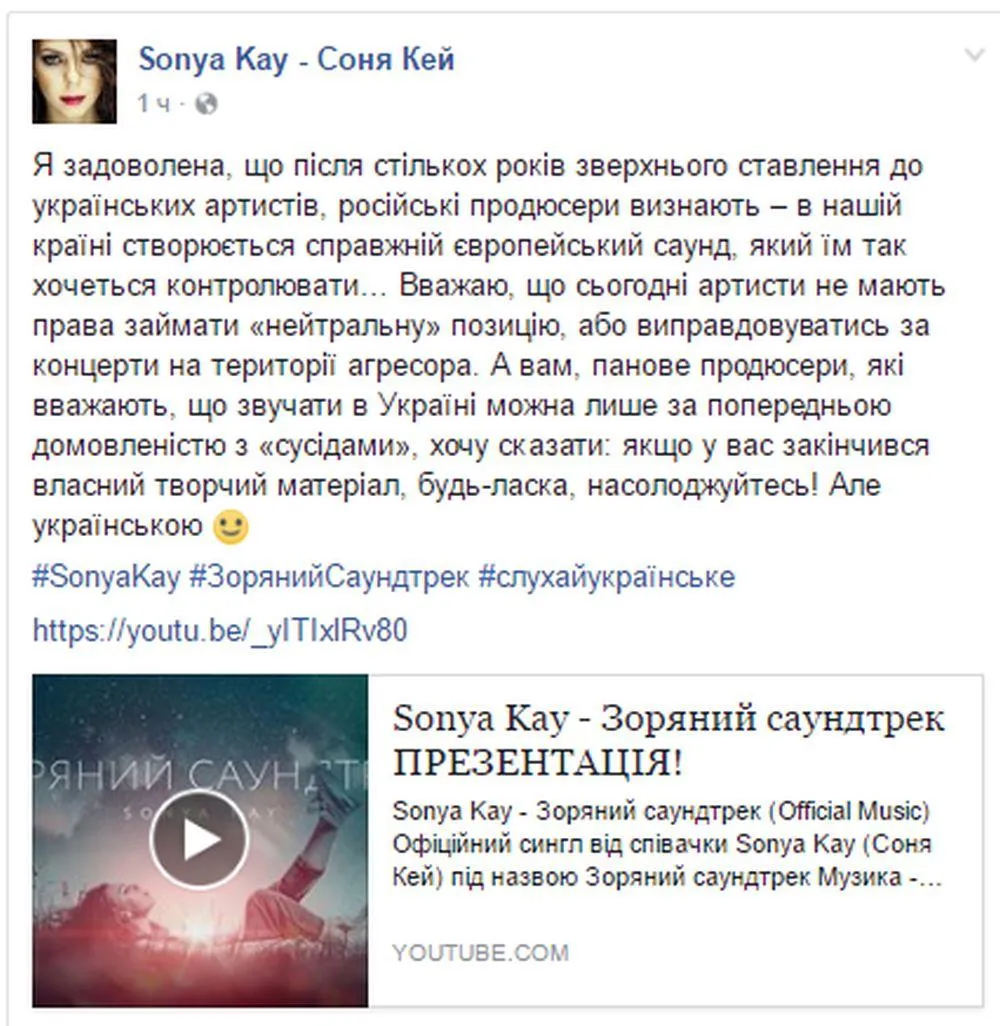 Я задоволена, що після стількох років зверхнього ставлення до українських артистів, російські продюсери визнають – в нашій країні створюється справжній європейський саунд, який їм так хочеться контролювати… Вважаю, що сьогодні артисти не мають права займати "нейтральну" позицію, або виправдовуватись за концерти на території агресора. А вам, панове продюсери, які вважають, що звучати в Україні можна лише за попередньою домовленістю з "сусідами", хочу сказати: якщо у вас закінчився власний творчий матеріал, будь-ласка, насолоджуйтесь! Але українською :)