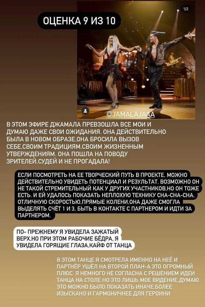 "Якщо подивитися на її творчий шлях на проєкті, можна дійсно побачити потенціал і результат. Можливо, він не такий стрімкий як в інших. Але він теж є. І їй вдалося показати непогану техніку, чудову швидкість, прямі коліна. Вона навіть змогла виділяти рахунок 1 з 3. Була в контакті з партнером та йшла за партнером. Як і раніше я побачила затиснутий верх, але при цьому робочі стегна. Я побачила кайф від танцю. Партнер відійшов на другий план, а це величезний плюс", – додала хореографиня.