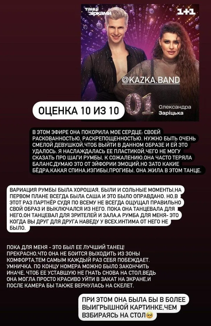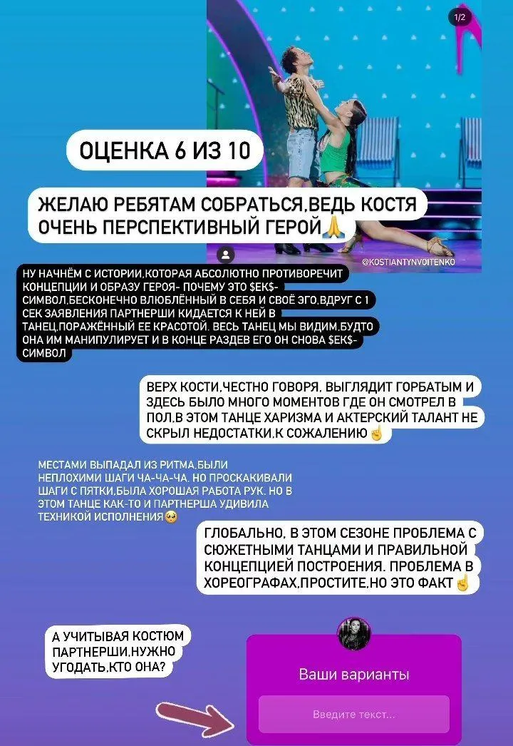 "Історія абсолютно суперечить концепції та образу. Чому це секс-символ? Нескінченно закоханий у себе і своє его. Раптом із першої секунди кидається до партнерки. Верх Костянтина виглядає горбатим, і було багато моментів, де він дивився у підлогу. У цьому танці акторський талант не приховав недоліків. Глобально в цьому сезоні проблема із сюжетними танцями", – поділилась танцівниця.