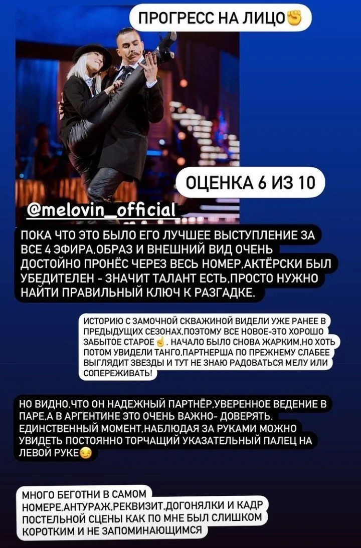 Поки що це був його найкращий виступ за всі 4 ефіри. Образ і зовнішній вигляд дуже гідно проніс через увесь номер. Акторськи був переконливий. Але партнерка, як і раніше, виглядає слабше за зірку, і тут не знаю радіти Мелу або співпереживати,
