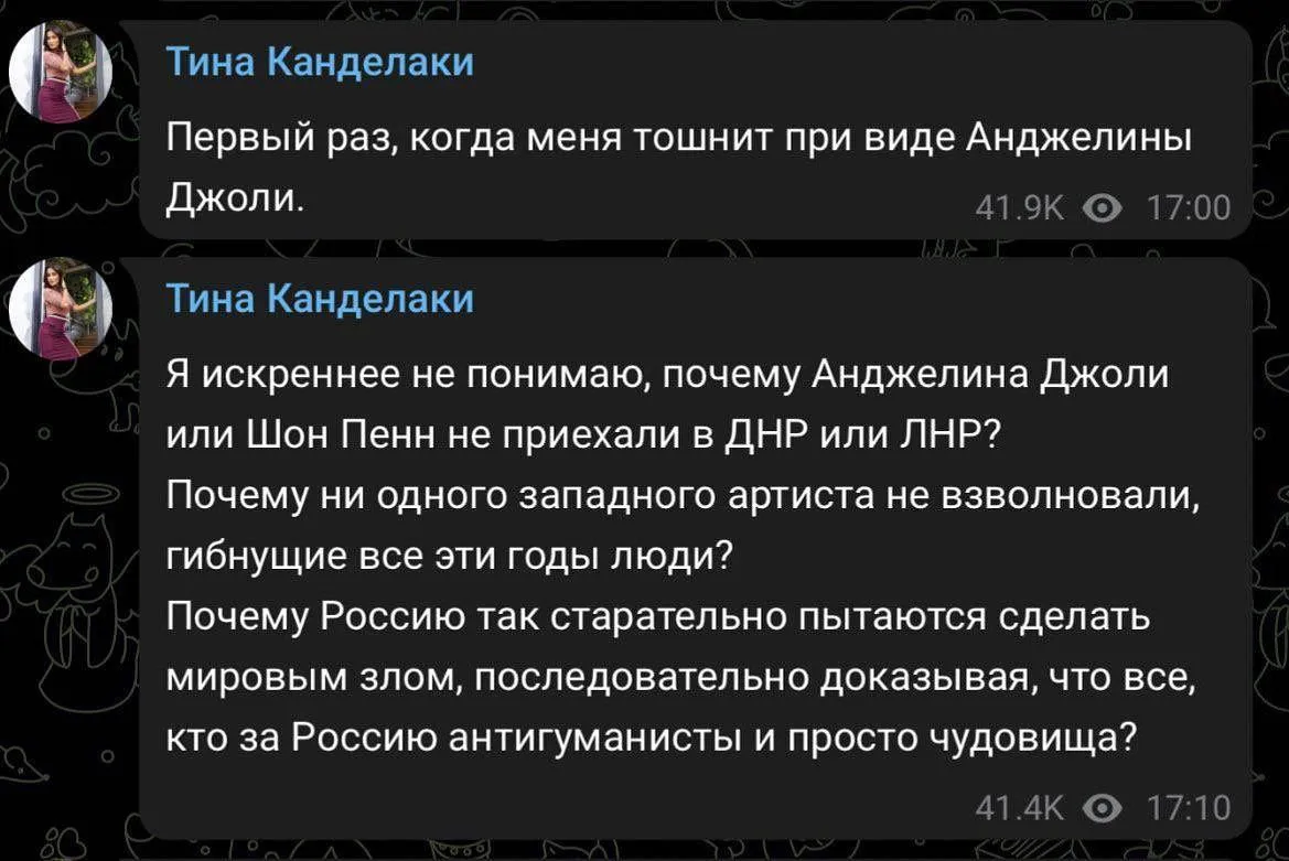 А скільки разів побувала сама Тіна Канделакі там? Ось я, наприклад, був у Луганській і Донецькій області двічі, звісно, на стороні України, світла і любові, підтримуючи ЗСУ концертами, як і мої колеги Кароль, TAYANNA, Мірзоян і т.д. А ми окрім Пореченкова, який приїхав постріляти в українців, тебе, Канделакі не пам'ятаємо,