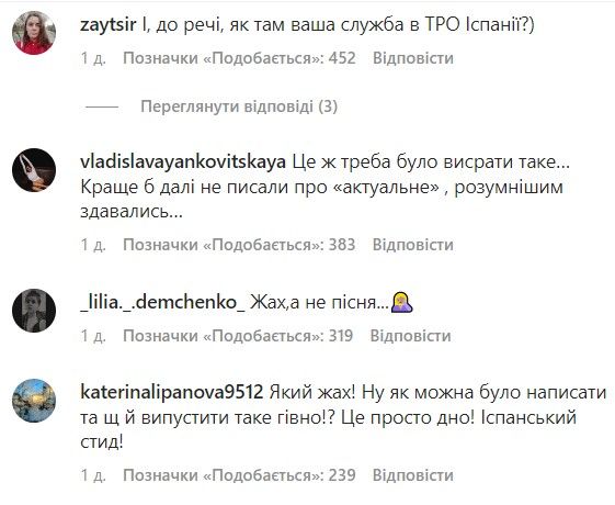 - "Видаліть цю пісню, щоб не ганьбитися далі. Час таких пісеньок давно минув, якшо самостійно не змогли зрозуміти, то по реакції людей можете здогадатися".