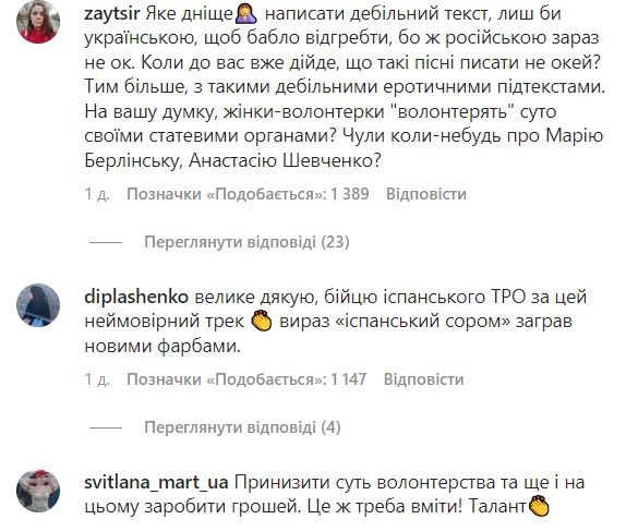 - "Яке дніще. Написати дебільний текст, лиш би українською, щоб бабло відгребти, бо ж російською зараз не ок. Коли до вас вже дійде, що такі пісні писати не окей? Тим більше з такими дебільними еротичними підтекстами. На вашу думку, жінки-волонтерки "волонтерять" суто своїми статевими органами?";